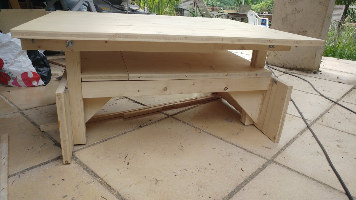 Les plateaux sont en tri-pli d’épicea, 22mm : Ça donne un rendu bois brut, c’est robuste et se déforme moins facilement. Les grands pieds sont des tasseaux de pin 57x57mm Les petits pieds et traverses sont fabriqués dans les chutes de tri-pli : 44x44 mm découpés et collés.