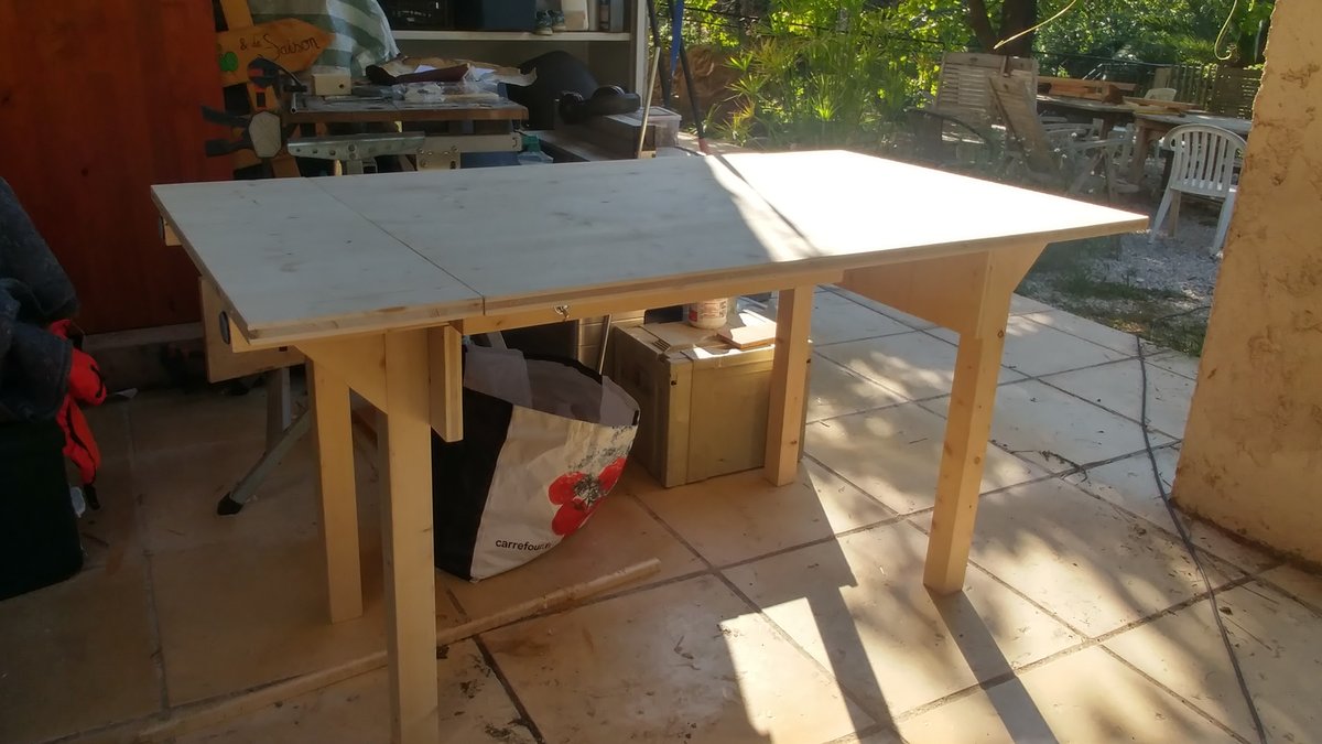 En position haute, les pivots décentrés permettent à la table de tenir debout, maintenue sous son propre poids : une fois les écrous papillons sérrés, le tout est bien stable; J’ai tout de même ajouté deux verrous à glissière sous la table, par acquis de conscience, histoire d’éviter qu’elle se referme quand on la déplace.
