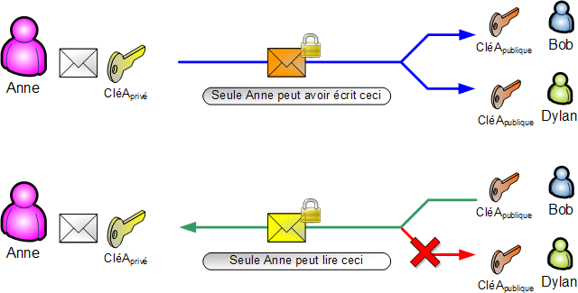 - Signer un message : l’auteur signe le message avec sa clef privée. Tout le monde peut vérifier avec la clef publique de l’auteur qu’il a signé ce message avec sa clef privée