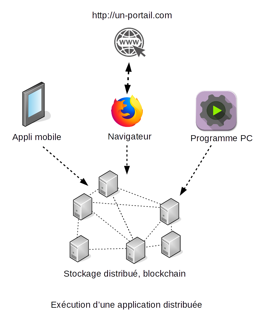 - un portail web (un site) : La logique est alors exécutée coté client, dans votre navigateur, par du Javascript qui accède en arrière plan à la blockchain. L’utilisateur pense alors visiter un site standard. Cette méthode présente l’avantage d’une large adoption, aucun programme spécifique n’étant requis, autre qu’un navigateur moderne. Ces portails peuvent aussi permettre une indexation des contenus publics par les moteurs de recherche standards (SEO).